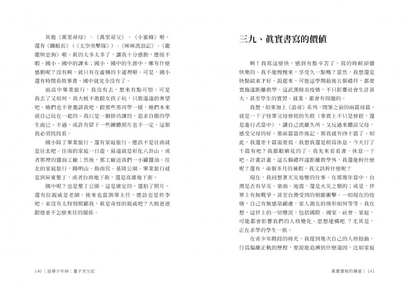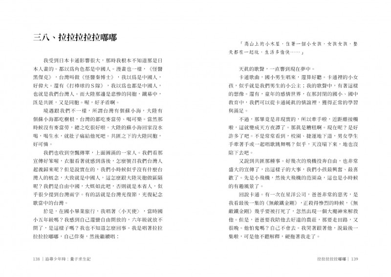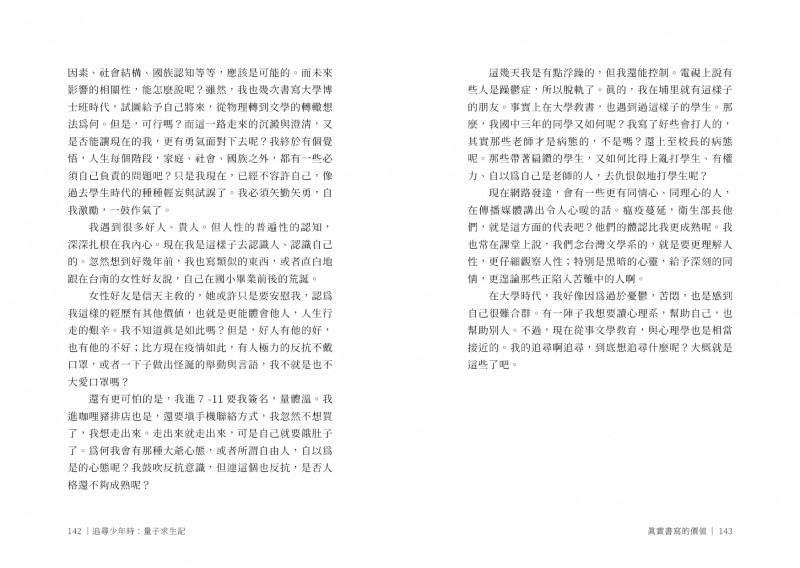 其試圖重新縫合自己卻不成後,只好自行擦乾眼淚,再積極藉由文學,澄清自我的書寫,讀來真摯卻平易近人,苦痛但不情感氾濫,讀者亦成為了量子,藉由此書碰撞出更多的能量了。 |